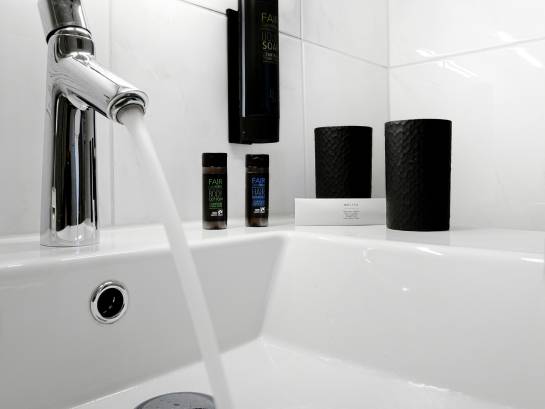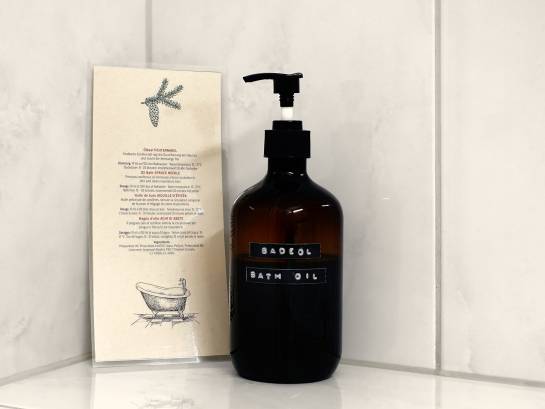 In the classic black and white style bathrooms with make-up mirror and hairdryer, selected care products are available for your daily well-being. A spruce oil guarantees a relaxing bath.
